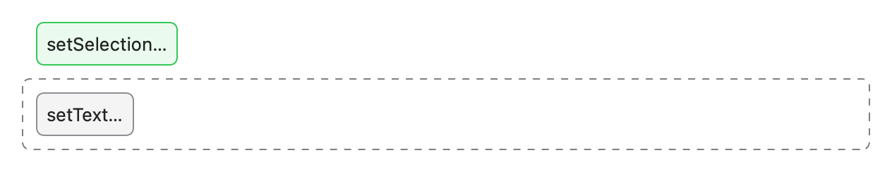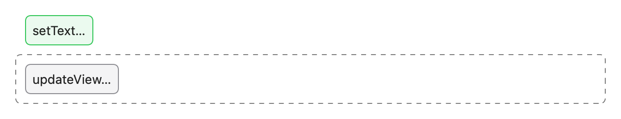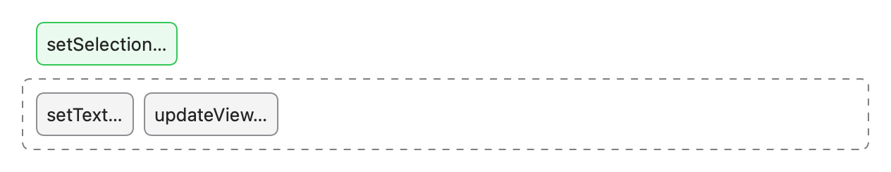 This setText also wants the view to redraw. However, because the view is already flagged as “dirty” by the setSelection block, no further block will be enqueued. So after setText runs, the queue looks like this: